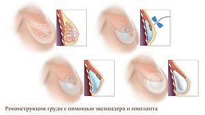Имплант – самый простой способ воссоздания прежней формы молочной железы. Он размещается либо перед грудной мышцей , либо за ней, и может состоять полностью из силикона или представлять собой полость из силикона, заполненную различными субстанциями (физиологический раствор, силиконовый гель). Для достижения нормальной формы необходимо достаточное количество кожи, если ее недостаточно, сначала устанавливается экспандер. Это мешочек из силикона с физраствором, который можно постепенно добавлять, за счет чего кожа понемногу растягивается. Экспандер может быть установлен как непосредственно во время удаления опухоли, так и позже. По достижении нужного результата в рамках еще одной операции устанавливается силиконовый протез.