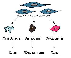 Стволовые клетки могут дифференцироваться в костную, хрящевую, жировую и соединительную ткани.