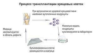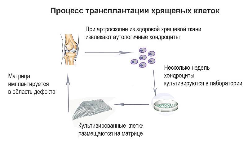 При трансплантации хряща или хрящевых клеток происходит замена утраченной части хряща трансплантатом. Он берется либо у самого пациента, либо у донора, и вживляется в рамках хирургического вмешательства.